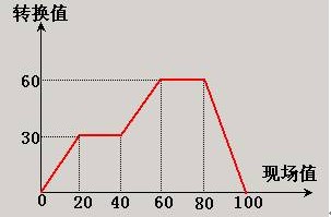 下面通過一個簡單的例子來說明一下分段線性化的使用方法。假設(shè)我們需要的轉(zhuǎn)換值和現(xiàn)場值之間有下圖紅線所示的函數(shù)關(guān)系: