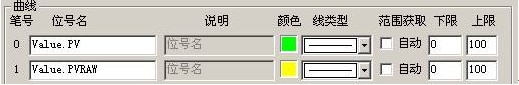為了方便的觀看轉(zhuǎn)換的結(jié)果,我們使用實(shí)時趨勢組件來顯示轉(zhuǎn)換前和轉(zhuǎn)換后的曲線圖。將導(dǎo)航器切換到畫面頁,雙擊“窗口”項創(chuàng)建一個名為Draw1的窗口。點(diǎn)擊工具條按鈕  ,在隨后彈出的子圖選擇對話框中,雙擊“趨勢分析/實(shí)時趨勢”組件,在窗口中創(chuàng)建該組件。雙擊實(shí)時趨勢組件,彈出設(shè)置對話框,在“曲線”頁上,在0號筆的位號編輯框中填入Value.PV,在1號筆的位號編輯框中填入Value.PVRAW,同時取消這兩支筆的范圍獲取自動選項,如下圖所示:
