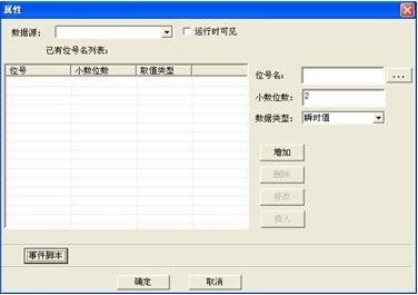 該組件通常運行時是隱藏的?梢栽趯傩栽O(shè)置對話框中增加所需查詢的歷史點(可以同時查詢多個)。通過點擊“事件腳本”,可以在此編寫所需的腳本語句,如圖所示: