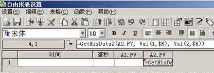 可以看到,報表的前3列分別是時間、毫秒和查詢的位號的數(shù)據(jù),可以在后面增加一列,比如A2.PV,見上圖。并在下面輸入如下的腳本=GetHisData2(A2.PV, Val(1,$R), Val(2,$R)) 。這段腳本的意義是取A2.PV的歷史數(shù)據(jù),其中時間采用左側(cè)第一列的時間,毫秒數(shù)采用左側(cè)第二列的時間。當(dāng)組件查詢到A1.PV的歷史數(shù)據(jù)的時候,會自動地增加報表的行數(shù)來存放相應(yīng)的數(shù)據(jù)。同時也會自動地復(fù)制上面輸入的腳本,這樣后面的列就能顯示A2.PV的相應(yīng)時刻的歷史數(shù)據(jù)了。