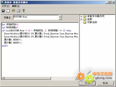在“數(shù)據(jù)庫”導(dǎo)航樹中的“腳本/值改變”下建立值改變動(dòng)作腳本,變量名為“$SYSTEM.Hour”,