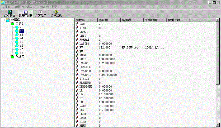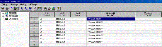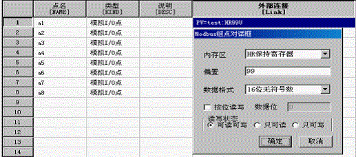 建立數(shù)據(jù)庫模擬I/O點,a1-a8,然后關(guān)聯(lián)外部連接,點名建立后雙擊后邊外部連接的空白處,彈出modbus組點對話框,選擇保持寄存器也就是modbus的功能碼03,偏置地址選擇99,對應(yīng)的modbus協(xié)議的地址是100(紫金橋軟件的偏置地址加1對應(yīng)的是modbus協(xié)議地址)如圖6所示;