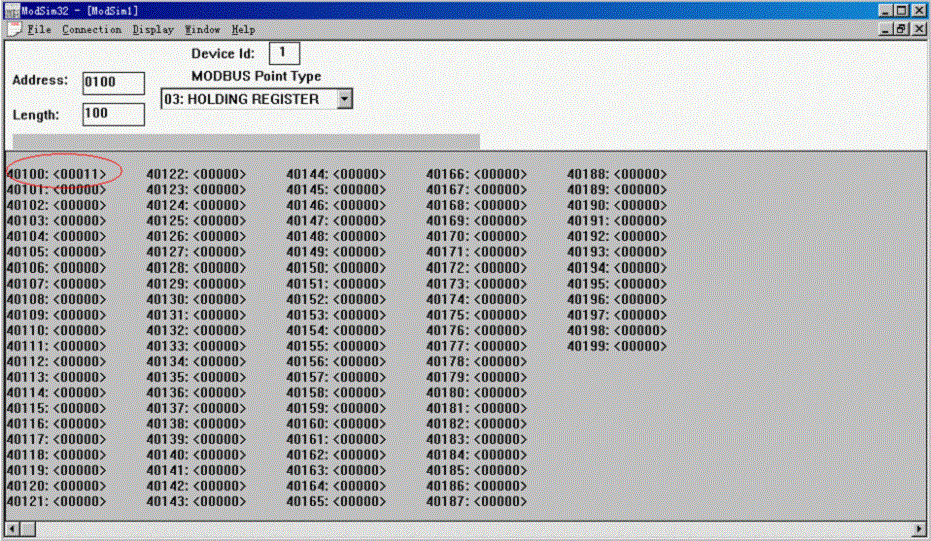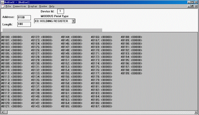 點擊“file”,然后點擊“new”新建一個窗口,Device Id:1對應(yīng)的是組態(tài)軟件里的設(shè)備地址1,03:HOLDING REGISTER對應(yīng)的是保持寄存器。ADDRESS:0100是從地址100開始。如下圖所示;