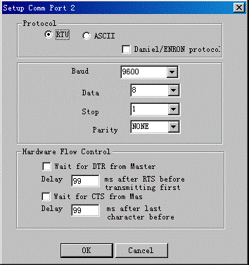 通訊協(xié)議選擇“RTU”,波特率,數(shù)據(jù)位,奇偶校驗和停止位和紫金橋組態(tài)軟件上的端口參數(shù)設(shè)置要一致,點擊OK設(shè)置完成。