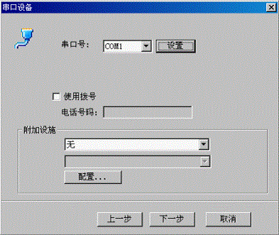 設(shè)置完成,點擊“下一步“,進(jìn)入下一個對話框,串口號選擇”com1”。如圖3所示;