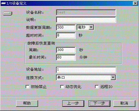 設(shè)置設(shè)備驅(qū)動,設(shè)備名稱是“test”,數(shù)據(jù)刷新周期300毫秒,設(shè)備地址是1。如圖2所示: