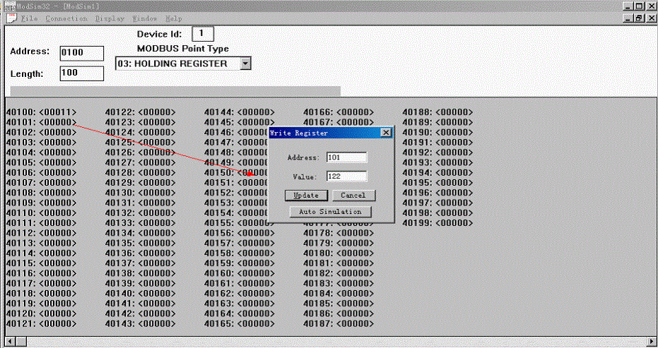 也可以通過MODBUS仿真軟件設(shè)置數(shù)據(jù)。雙擊101寄存器,彈出如下對話框,設(shè)置數(shù)據(jù),點擊UPDATA。