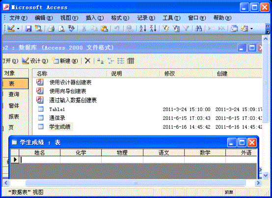 之后,建表。雙擊打開新建的數(shù)據(jù)源,在數(shù)據(jù)庫窗口對(duì)象\表\使用設(shè)計(jì)器創(chuàng)建表,創(chuàng)建學(xué)生成績表(空表)如圖二: