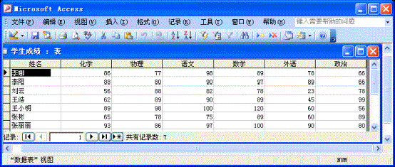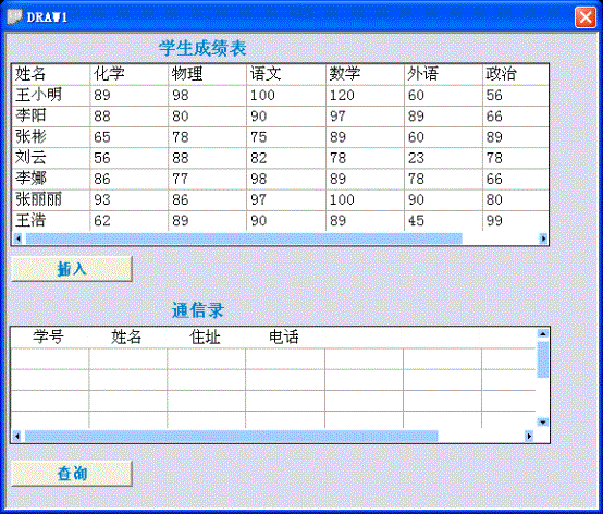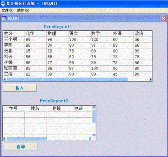 1.把紫金橋FreeReport1表中的數(shù)據(jù),寫入Access數(shù)據(jù)庫中的空表學(xué)生成績中。在運(yùn)行窗口點(diǎn)擊插入按鈕,打開db2.mdb中的表學(xué)生成績后,看到FreeReport1表中的數(shù)據(jù)以全部存入表學(xué)生成績中。如圖八: