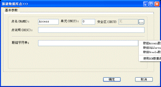 1. 訪問本地Access數(shù)據(jù)庫。在數(shù)據(jù)庫\點(diǎn)組態(tài),雙擊打開DateBase Config Tool窗口新建表報(bào)關(guān)系數(shù)據(jù)源點(diǎn),在彈出的新建數(shù)據(jù)庫點(diǎn)窗口中輸入點(diǎn)名,點(diǎn)擊連接字符串后面的文本框后面的按鈕選擇連接的數(shù)據(jù)庫。如圖五: