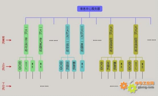 該公司下設(shè)十二個(gè)大隊(duì),每個(gè)大隊(duì)下最少的有兩個(gè)站隊(duì),最多則有八個(gè)站隊(duì),每個(gè)站隊(duì)有若干臺(tái)上位機(jī)從下位機(jī)采集數(shù)據(jù),各個(gè)上位機(jī)采集數(shù)據(jù)后分別通過(guò)不同的通訊方式上傳到本站隊(duì)的前置機(jī)中的紫金橋?qū)崟r(shí)數(shù)據(jù)庫(kù),前置機(jī)再將紫金橋?qū)崟r(shí)數(shù)據(jù)庫(kù)中的數(shù)據(jù)通過(guò)以太網(wǎng)上傳到公司信息中心的服務(wù)器中的紫金橋?qū)崟r(shí)數(shù)據(jù)庫(kù),最后信息中心的服務(wù)器將實(shí)時(shí)數(shù)據(jù)庫(kù)中的數(shù)據(jù)保存為歷史,同時(shí)轉(zhuǎn)儲(chǔ)到關(guān)系數(shù)據(jù)庫(kù),并且信息中心的服務(wù)器將各個(gè)站隊(duì)的工藝流程示意圖通過(guò)web發(fā)布,實(shí)時(shí)顯示上位機(jī)采集到的數(shù)據(jù)。