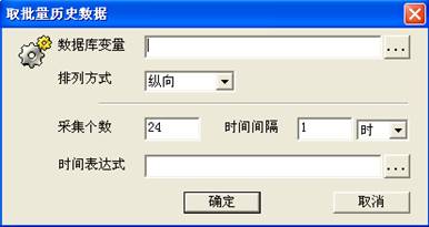 在“數(shù)據(jù)庫(kù)變量”中填寫所關(guān)聯(lián)的數(shù)據(jù)點(diǎn),比如“A1.pv”,根據(jù)實(shí)際情況設(shè)定“采集個(gè)數(shù)”和“時(shí)間間隔”,“采集個(gè)數(shù)”不能填寫為變量。這里的“時(shí)間表達(dá)式”是指批量歷史中首個(gè)采集點(diǎn)的時(shí)間,可以是一個(gè)整形變量,其值是前文中提到的1970年1月1日08:00時(shí)過(guò)去的秒數(shù)。
