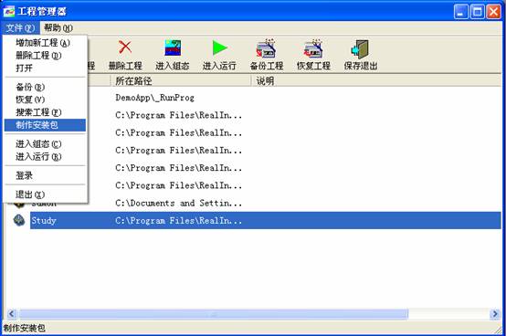 在工程管理器下,選擇菜單“文件/制作安裝包”,如下所示: