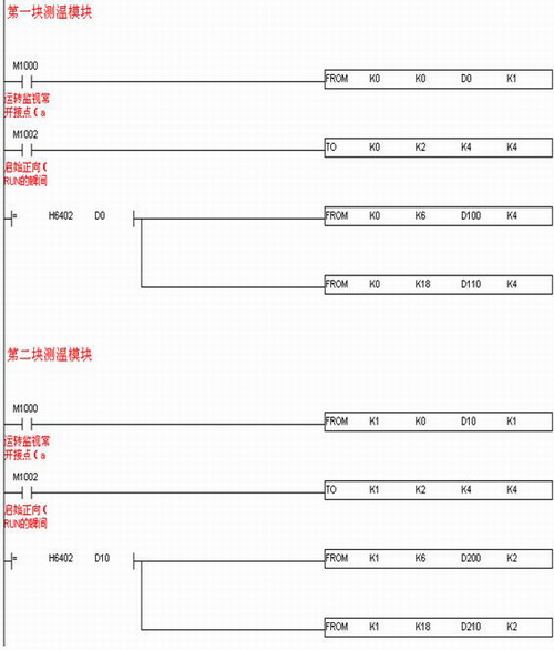 3.2、PLC 溫度數(shù)據(jù)采集程序的編制 DVP04PT 溫度測(cè)量模塊可接受外部4 點(diǎn)鉑金屬溫度傳感器(PT 100 3 線 100Ω),將其轉(zhuǎn)換成14 位的數(shù)字信號(hào)。通過(guò)DVP-PLC 主機(jī)程序以指令FROM / TO 來(lái)讀寫模塊內(nèi)的數(shù)據(jù),模塊內(nèi)具有49 個(gè)CR(Controlled Register)寄存器,每個(gè)寄存器有16 Bits。電源單元與模塊分離,體積小,安裝容易?蛇x擇攝氏溫度(℃)或華氏(℉)溫度,攝氏溫度輸入分辨率為0.1℃,華氏溫度輸入分辨率為0.18℉。 兩塊溫度測(cè)量模塊擴(kuò)展于PLC主機(jī)的右側(cè), 6支三線制PT100溫度傳感器按規(guī)定接入2塊DVP04PT溫度測(cè)量模塊中,第一塊接入4支,接入4個(gè)通道,第二塊接入2支,使用1、2兩個(gè)通道,不用的通道,短接避免干擾。依據(jù)臺(tái)達(dá)PLC特殊擴(kuò)展模塊的規(guī)則:主機(jī)DVP32EH右側(cè)第一個(gè)特殊擴(kuò)展模塊所在的位置編號(hào)為K0, 右側(cè)第二個(gè)特殊擴(kuò)展模塊所在的位置編號(hào)為K1,依此類推,最多擴(kuò)展八塊… … 編寫溫度采集的數(shù)據(jù)程序如下: