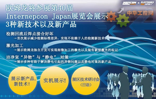 歐姆龍將參展于2011年1月19日至21日在日本東京有明國(guó)際展覽中心 (Tokyo Big Sight, Japan)舉行的Internepcon Japan展覽會(huì)。歐姆龍不斷追求生產(chǎn)現(xiàn)場(chǎng)品質(zhì)的提高,提供優(yōu)良的產(chǎn)品。本次歐姆龍展位的看點(diǎn)在于有效提高品質(zhì)的3種新產(chǎn)品和新技術(shù)。真誠(chéng)歡迎你光臨歐姆龍展位。