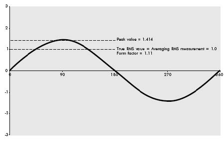 在測(cè)量一個(gè)純正弦波(僅限于純正弦波)時(shí),簡(jiǎn)單的測(cè)出平均值(0.636倍峰值),再乘以波形因數(shù)1.111(即0.707倍峰值)所得到的數(shù)值是完全正確的,這個(gè)數(shù)值也被稱(chēng)為有效值。這種方法被廣泛用于所有的模擬測(cè)量?jī)x(此時(shí)平均值是靠線(xiàn)圈運(yùn)動(dòng)的慣性和阻尼作用來(lái)實(shí)現(xiàn)的)和所有舊式、儀表和大多數(shù)電流表數(shù)字萬(wàn)用表上。這種技術(shù)被稱(chēng)為“平均讀數(shù),按有效值校準(zhǔn)”的測(cè)量方法。