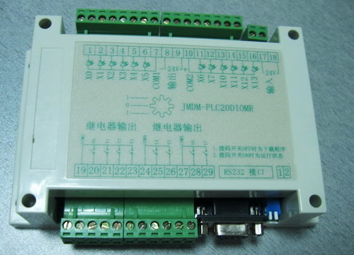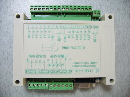 一、功能特性 1.8位高性能單片機(jī)作為主控制芯片,32K程序存儲(chǔ)空間(若有特定需要可用64K存儲(chǔ)空間的芯片);16K數(shù)據(jù)存儲(chǔ)空間(若有特定需要可用32K存儲(chǔ)空間的芯片),可用來保存數(shù)據(jù),斷電數(shù)據(jù)不丟失; 2.主電源采用18V交流電(或DC12V、DC24V,可選),外圍驅(qū)動(dòng)電源采用24/12V直流電; 3.12路全光電隔離數(shù)字量輸入,NPN輸入形式,輸入電流為10mA;其中有兩路可作中斷源用于計(jì)數(shù); 4.8路光電隔離數(shù)字量繼電器輸出,可接220V電壓,最大承受電流是5A;每路最大負(fù)載1.1KW, 5.采用光電隔離和啟用內(nèi)部看門狗及嚴(yán)格的高頻濾除特性,使系統(tǒng)工作穩(wěn)定可靠,無死機(jī)現(xiàn)象; 6.有1路標(biāo)準(zhǔn)的RS232串行通信接口(抗15KV靜電沖擊),可直接與電腦或文本顯示器等外設(shè)通信,實(shí)現(xiàn)串口實(shí)時(shí)監(jiān)控輸入、輸出點(diǎn)的狀態(tài); 7.可直接通過RS232接口下載程序,無需燒錄器,方便程序修改、升級(jí); 8.有一盞LED燈顯示工作狀態(tài),有一個(gè)撥碼開關(guān)可根據(jù)程序需要設(shè)定程序狀態(tài)或程序參數(shù); 9.外殼采用螺釘固定或?qū)к壈惭b,一體化緊湊型設(shè)計(jì)。 外殼尺寸:長(zhǎng)×寬×高為: 146mm×90mm×40mm; 內(nèi)部控制板尺寸:長(zhǎng)×寬×高為: 122mm×86mm×28mm; 10.用Keil C 或匯編編程,用戶編程有困難的可把工藝流程發(fā)給我司,我司可幫助編程。 二、用途 1.可用于各種20個(gè)點(diǎn)以內(nèi)的控制系統(tǒng),可控制氣缸,電磁閥,繼電器,可外接光電式,電容式,電感式,霍爾式等各種傳感器; 2.可用于替代20點(diǎn)以內(nèi)的國(guó)外品牌PLC,用于各種控制場(chǎng)合(如各種機(jī)器控制),性價(jià)比更高; 3.可用于單片機(jī)學(xué)習(xí)和試驗(yàn); 4、可用于串口控制8路繼電器輸出,用于電腦、觸摸屏上實(shí)時(shí)監(jiān)控各種開關(guān)量信號(hào)的狀態(tài),如實(shí)時(shí)監(jiān)控?zé)艄、電源開關(guān)等信號(hào)應(yīng)用。