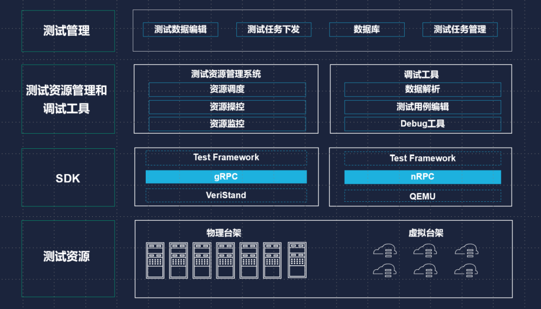 隨著新車迭代加速,傳統(tǒng)HIL測試方法在實時性、兼容性、數據閉環(huán)等方面面臨嚴峻挑戰(zhàn)。為此,蔚來測試工具鏈團隊構建了 “基座搭建→跨語言通信→數字化賦能→AI 升級” 四層架構,在該架構中,NI平臺憑借“模塊化架構和開放兼容性”,被選為系統(tǒng)基座。