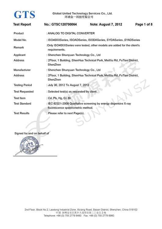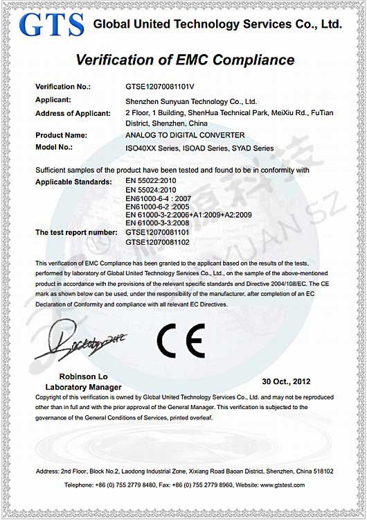 2012年10月通過EMC測(cè)試獲得CE認(rèn)證,2012年8月通過RoHs無鉛環(huán)保認(rèn)證。