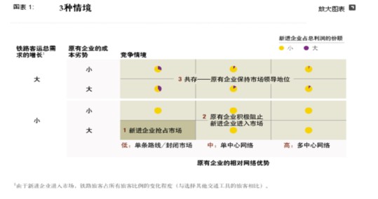 如果鐵路需求可以被刺激起來,參與者將可能在共同盈利的情況下共存。但模型顯示,即使是在進(jìn)攻者享有最佳條件的情況下,原有企業(yè)仍可能保持市場(chǎng)領(lǐng)導(dǎo)地位。由于原有企業(yè)通常能夠容忍進(jìn)攻者進(jìn)入小規(guī)模市場(chǎng),因此,理性的進(jìn)攻者比較傾向于接受這樣的格局。任何一方更具侵略性的行動(dòng)都會(huì)引發(fā)毀滅性的價(jià)格戰(zhàn)或服務(wù)的擴(kuò)張,破壞行業(yè)整體的盈利性。