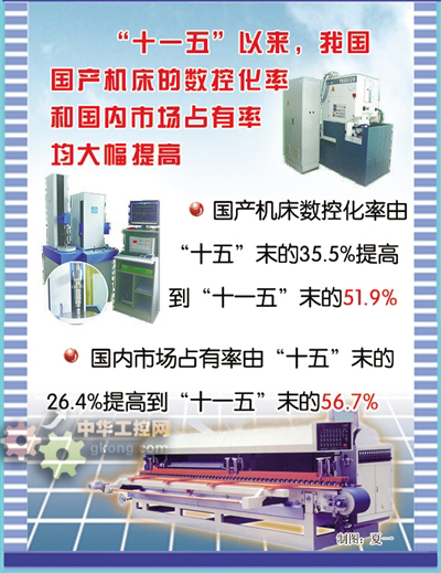 “十一五”以來(lái),我國(guó)國(guó)產(chǎn)機(jī)床的數(shù)控化率和國(guó)內(nèi)市場(chǎng)占有率均大幅提高。其中,國(guó)產(chǎn)機(jī)床數(shù)控化率由“十五”末的35.5%提高到“十一五”末的51.9%,國(guó)內(nèi)市場(chǎng)占有率由“十五”末的26.4%提高到“十一五”末的56.7%。特別值得一提的是,專(zhuān)項(xiàng)實(shí)施在應(yīng)對(duì)國(guó)際金融危機(jī)沖擊中發(fā)揮了積極作用,增強(qiáng)了重點(diǎn)骨干企業(yè)的創(chuàng)新和競(jìng)爭(zhēng)能力。“十一五”末,我國(guó)機(jī)床企業(yè)前10名銷(xiāo)售收入之和已占到機(jī)床行業(yè)銷(xiāo)售收入的25%左右。