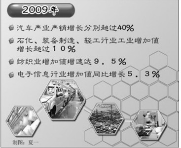 2009年十大產(chǎn)業(yè)調(diào)整和振興中,汽車產(chǎn)業(yè)表現(xiàn)最為搶眼,產(chǎn)銷增長分別超過四成,中國躋身汽車產(chǎn)量第一大國。石化、裝備制造、輕工行業(yè)工業(yè)增加值增長超過10%。紡織業(yè)增加值增速達9.5%。電子信息行業(yè)受國際金融危機沖擊較大,增加值同比增長5.3%,但其中筆記本計算機增長38.8%,手機增長9.8%;彩電增長9.3%,其中液晶電視機增長85.2%,成績不俗。