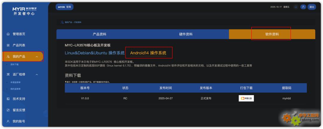 登錄米爾開(kāi)發(fā)者中心(https://dev.myir.cn/auth/login.html),在開(kāi)發(fā)者平臺(tái)注冊(cè)綁定產(chǎn)品信息,在包裝盒側(cè)面會(huì)有一個(gè)產(chǎn)品型號(hào)系列號(hào),可通過(guò)微信掃碼綁定。 綁定成功后,依次點(diǎn)擊我的產(chǎn)品->軟件資料->Android14操作系統(tǒng):