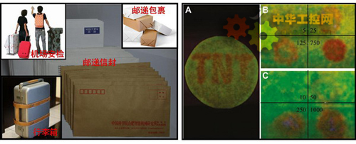 在國(guó)家自然科學(xué)基金委、中國(guó)-新加坡國(guó)際合作重點(diǎn)項(xiàng)目的支持下,中科院合肥物質(zhì)科學(xué)研究院智能所張忠平研究員和王素華研究員(中科院“百人計(jì)劃”)領(lǐng)銜的研究團(tuán)隊(duì),針對(duì)包裹表面痕量爆炸物及時(shí)、現(xiàn)場(chǎng)檢測(cè)這一極具挑戰(zhàn)性的難題,利用量子點(diǎn)優(yōu)越的光學(xué)性質(zhì),通過(guò)對(duì)其表面進(jìn)行爆炸物梯恩梯的識(shí)別功能化,設(shè)計(jì)并構(gòu)建了可視化紙質(zhì)傳感器。相關(guān)研究結(jié)果申報(bào)了國(guó)家發(fā)明專(zhuān)利,并在國(guó)際著名化學(xué)期刊《美國(guó)化學(xué)會(huì)志》(J. Am. Chem. Soc.)上發(fā)表。