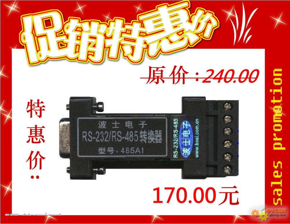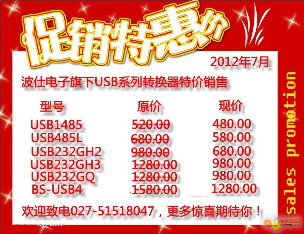 武漢波仕電子7月大優(yōu)惠,為了感謝廣大新老客戶對波士的支持、好評,波士電子優(yōu)惠酬賓活動:USB口轉換為1個RS-485(USB1485)、USB轉RS232/RS485/422轉換器(USB485L)、隔離器型USB轉232/485、422轉換器(USB232GH2). USB高速隔離型串口轉換器(USB232GH3),高速隔離USB轉全信號RS232(USB232GQ),USB一擴4集線器(BS-USB4)等產(chǎn)品,新老客戶均有優(yōu)惠,歡迎前來采購下單。
