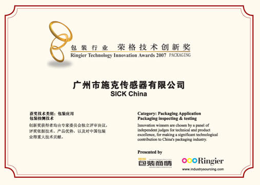 經(jīng)過用戶推薦和專家公正評審,擁有超過60年生產(chǎn)研發(fā)傳感器歷史的施克公司憑借在包裝行業(yè)多年積累的深厚技術(shù)實力,為客戶帶來了成熟領(lǐng)先的產(chǎn)品和優(yōu)質(zhì)的服務(wù),并將領(lǐng)先業(yè)界的行業(yè)解決方案理念帶入中國,對中國包裝行業(yè)的自動化進(jìn)程做出了重大貢獻(xiàn),榮獲“2007包裝行業(yè)榮格技術(shù)創(chuàng)新獎”。