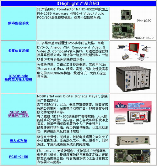 此次威強(qiáng)在2006中國(guó)(北京)國(guó)際網(wǎng)絡(luò)安全技術(shù)與應(yīng)用展覽會(huì)里將展出展示安防監(jiān)控系統(tǒng)外同時(shí)展示符合歐盟RoHS指令之最新單板計(jì)算機(jī)及嵌入式主板、電源模塊、以及通過(guò)IP65認(rèn)證的工作站電腦、平板電腦、醫(yī)療應(yīng)用平板電腦、在系統(tǒng)方面同時(shí)也展出嵌入式系統(tǒng)、特別是今年度才推出最先進(jìn)的多媒體廣告播放機(jī)NDSP-500,多媒體顯示器等,來(lái)到威強(qiáng)的攤位走一遭您將有機(jī)會(huì)第一時(shí)間接觸威強(qiáng)最新工業(yè)等級(jí)解決方案,并與威強(qiáng)產(chǎn)品專家交換心得,讓威強(qiáng)不斷的創(chuàng)新的產(chǎn)品與貼心OEM/ODM的服務(wù)內(nèi)容,引領(lǐng)您進(jìn)入工業(yè)電腦包羅萬(wàn)象的應(yīng)用范例。