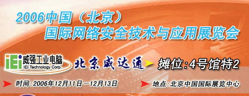威強(qiáng)工業(yè)電腦股份有限公司為了拓展中國(guó)華北地區(qū)商機(jī),服務(wù)更多華北當(dāng)?shù)仄髽I(yè)應(yīng)用工業(yè)電腦,建立企業(yè)安全網(wǎng)路架構(gòu),于2006年12月11日(一)至12月13日(三)與當(dāng)?shù)乇本┙?jīng)銷商威達(dá)通聯(lián)合參加2006中國(guó)(北京)國(guó)際網(wǎng)絡(luò)安全技術(shù)與應(yīng)用展覽會(huì)。