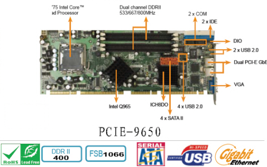 PCIE-9650采用Intel Q965 + ICH8DO最新芯片組,支持Intel LGA775 Core 2 Quad處理器,F(xiàn)SB最大可達1066MHz;4根雙通道的DDRII內(nèi)存插槽,最大可支持到8GB的內(nèi)存,引領(lǐng)工業(yè)電腦進入Core 2/DDRII的嶄新時代。同時PCIE-9650采用PICMG1.3規(guī)范,支持最新的I/O接口規(guī)格,包括PCI-E總線、6個USB 2.0、4個帶Raid 0/1/10的SATAII、雙PCI-E高性能千兆網(wǎng),提升了整個工業(yè)電腦平臺的系統(tǒng)頻寬。