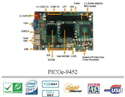 PICOe-9452采用ntel® Socket479 Core 2 Duo, Core Duo/Solo CPU插槽,采用Intel® 945GM + ICH7M芯片組,F(xiàn)SB最高可達(dá)667MHz ,2根DDRII內(nèi)存插槽最大可支持到4GB。PICOe-9452還支持雙千兆以太網(wǎng)、5個(gè)USB2.0、2個(gè)SATAII接口、LVDS接口。配合最新的PICOe底板,PICOe-6612LVDS可擴(kuò)充4個(gè)32位標(biāo)準(zhǔn)PCI插槽和多個(gè)PCI-E x4、PCI-E x1插槽。