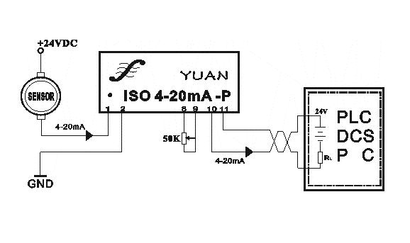 ISO 4-20mA-P是一種兩線制4-20mA 信號隔離調(diào)理器,它可以將有源4-20mA電流信號轉(zhuǎn)換成隔離的無源電流信號,二線制供電回路(防爆方式)輸出。屬于SUNYUAN ISO 4-20mA系列的產(chǎn)品。 該IC內(nèi)部包含有電流信號調(diào)制解調(diào)電路、信號耦合隔離變換電路等。很小的輸入等效電阻,使該IC能夠從傳感器回路中采集到的信號電壓達到超寬范圍(7.5—32V),以滿足用戶無需外接輔助電源而實現(xiàn)信號遠距離、無失真?zhèn)鬏數(shù)男枰T揑C輸出是針對24VDC和取樣電阻(負載電阻)相串聯(lián)的二線制供電回路來設計的,同當前流行的模擬量輸入接口板(上位機)、PLC、DCS或其他儀表的模擬量輸入端口相匹配。 ISO 4-20mA-P產(chǎn)品使用非常方便,只需外接一個50KΩ的多圈電位器進行ADJ校正,即可實現(xiàn)兩線制4-20mA信號的隔離、傳輸和變送功能或信號的一進二出、二進二出等變換功能。