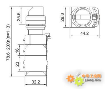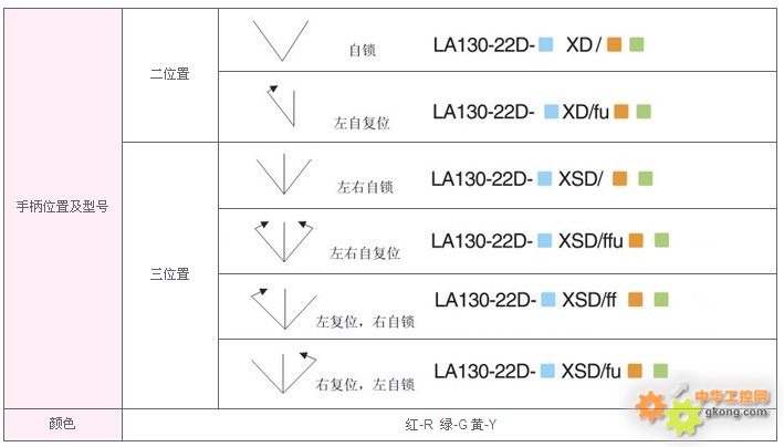 3. 型號舉例:1常開觸點,紅色AC/DC24V,短柄二位置自鎖旋鈕:LA130-22D-10XD/R 23