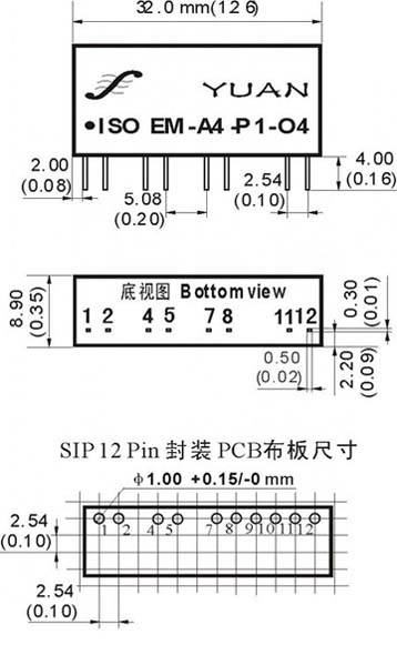 產(chǎn)品概述: 雙向直流(電壓/電流)信號(hào)隔離轉(zhuǎn)換器是一種混合集成電路。產(chǎn)品主要用于工業(yè)控制系統(tǒng)中模擬信號(hào)輸入輸出控制,系統(tǒng)內(nèi)部通過(guò)DSP、PLC的DA轉(zhuǎn)換輸出信號(hào)來(lái)顯示和控制其它裝置的可調(diào)輸出,現(xiàn)場(chǎng)工作電壓、電流和各種運(yùn)行參數(shù)的監(jiān)測(cè)及系統(tǒng)外部增加4-20mA(0-20mA)/0-5V標(biāo)準(zhǔn)信號(hào)接口等。該IC為標(biāo)準(zhǔn)Sip12 Pin符合UL-94的阻燃封裝,占用PCB板面積少,裝入儀器內(nèi)部可以并聯(lián)安裝實(shí)現(xiàn)多路信號(hào)的監(jiān)測(cè)、隔離和轉(zhuǎn)換。IC在同一芯片上集成了一個(gè)多隔離的DC/DC變換電源和一組模擬信號(hào)隔離放大器,輸入及輸出側(cè)寬爬電距離及內(nèi)部隔離措施使該芯片可達(dá)到3000VDC絕緣電壓。Sunyuan ISO EM系列產(chǎn)品使用非常方便,免零點(diǎn)和增益調(diào)節(jié),無(wú)需外接調(diào)節(jié)電位器等任何元件,即可實(shí)現(xiàn)工業(yè)現(xiàn)場(chǎng)信號(hào)的隔離轉(zhuǎn)換功能。 ● 變頻器等設(shè)備對(duì)EMC(電磁干擾)有要求使用場(chǎng)合可根據(jù)客戶現(xiàn)場(chǎng)技術(shù)要求定制產(chǎn)品,請(qǐng)訂貨時(shí)說(shuō)明。 ● 產(chǎn)品有PCB板上焊接安裝和標(biāo)準(zhǔn)DIN 35導(dǎo)軌卡槽固定安裝兩種方式,導(dǎo)軌式安裝的可以實(shí)現(xiàn)模擬信號(hào)一 進(jìn)二出、二進(jìn)二出的功能。 ● 0-±5V/0-±10V/0-75mV/0-2.5V/0-1mA/0-±10mA/0-±20mA/4-20mA等國(guó)際標(biāo)準(zhǔn)信號(hào)輸入輸出。 精度等級(jí):0.1級(jí)、0.2級(jí);全量程范圍內(nèi)極高的線性度(非線性度< 0.1%),使用方便免零點(diǎn)增益調(diào)節(jié)。
