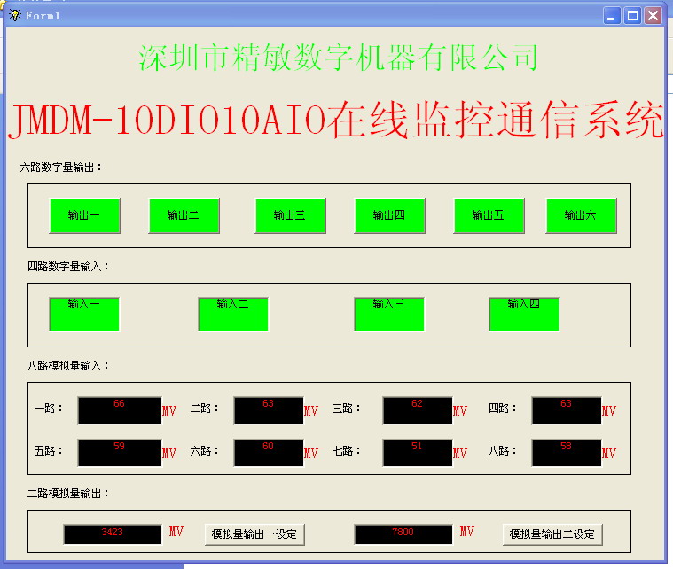 JMDM-10DIO10AIO串口控制模擬量數(shù)字量輸入輸出控制系統(tǒng),是深圳市精敏數(shù)字機(jī)器有限公司自主研發(fā)的工業(yè)級(jí)高可靠性單片機(jī)控制系統(tǒng),采用JMDM-10DIO10AIO工業(yè)控制器,以模擬量控制為主要特征,又可簡(jiǎn)稱為JMDM-10DIO10AIO在線監(jiān)控通信系統(tǒng)、JMDM RS485/232串口控制模擬量系統(tǒng)。實(shí)現(xiàn)了利用電腦串口在線監(jiān)控?cái)?shù)字量和模擬量輸入的狀態(tài);實(shí)時(shí)控制模擬量的輸出和數(shù)字量的輸出,支持通過RS232串口進(jìn)行功能擴(kuò)展I/O點(diǎn)數(shù)、A/D、D/A點(diǎn)數(shù),可用于電腦串口實(shí)現(xiàn)控制模擬量、數(shù)字量信號(hào)的學(xué)習(xí)、實(shí)驗(yàn)及各種工業(yè)應(yīng)用。