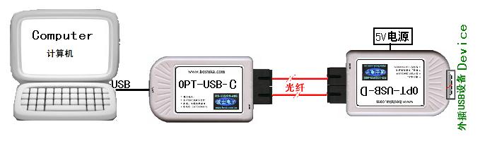 在圖3中,將USB設備外插到OPT-USB-D的USB座上,OPT-USB-D接上5V電源, OPT-USB-D與OPT-USB-C之間通過2根光纖交叉連接,OPT-USB-C與計算機的USB口相連。通過兩臺OPT-USB光纖延長器(D型與C型配對)可實現(xiàn)USB設備與計算機之間的遠程USB光纖通信。