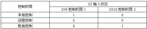 控制權(quán)限選擇(除保護(hù)模式外):90L顯示單元按鍵本地控制、DI端就地控制、上位機(jī)通訊遠(yuǎn)程控制。DI9、DI10組合實(shí)現(xiàn)三位置權(quán)限選擇。下表中“0”表示開關(guān)量輸入未接通,“1”表示接通。