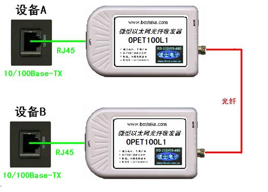 將OPET100L微型以太網(wǎng)光纖收發(fā)器通過以太網(wǎng)線外插到計(jì)算機(jī)或者HUB的RJ45以太網(wǎng)口。由于OPET100L支持自動MDI/MDIX,所以無須進(jìn)行電纜選擇,即直連線和交叉線這兩種線都可以。OPET100L默認(rèn)使用一對FC光纖接頭,TX發(fā)、RX收的區(qū)分見圖1。OPET100L可以成對使用,也可以與波仕或者其它品牌的以太網(wǎng)光纖收發(fā)器使用。OPET100L1為OPET100L的單纖版本,外形及性能同OPET100L,但是只有1個FC頭,只用一根光纖收發(fā),必須兩個OPET100L1成對使用。