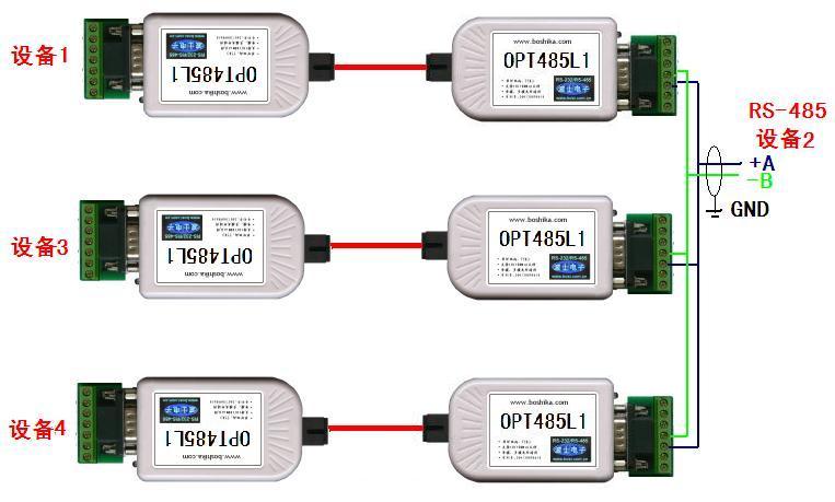 典型應用2:圖3為多臺串口設備通過多對OPT485L進行光纖組網(wǎng)通信的典型應用。最遠兩端的串口設備為RS-232、RS-485或RS-422,中間的設備為RS-485口。將中間的兩個OPT485L的A-A相連、B-B相連、GND-GND相連,再一起接到設備2的RS-485口上。這樣實現(xiàn)了多臺串口設備的組網(wǎng)通信,多機通信方法同RS-485電纜線組網(wǎng)。