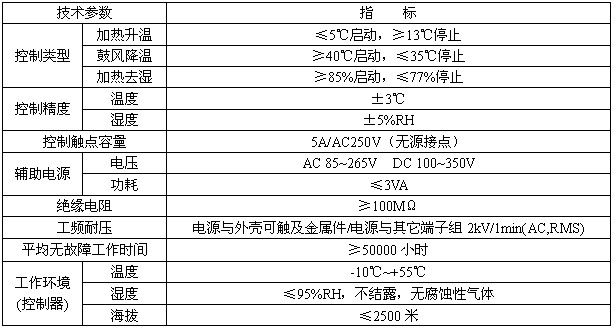 ● 控制器常規(guī)為環(huán)境濕度≥85%RH加熱除濕控制啟動,溫度≤5℃加熱升溫控制啟動,≥40℃鼓風降溫控制啟動;