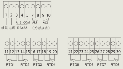 2組繼電器報警輸出,分別對應(yīng)2段溫度報警;