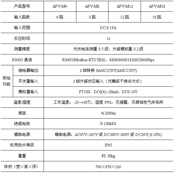 在光伏發(fā)電系統(tǒng)中,數(shù)量龐大的光伏電池組件進行串并組合達到需要的電壓電流值,以使發(fā)電效率達到最佳。APV-M系列智能光伏匯流箱主要作用就是對光伏電池陣列的輸入進行一級匯流,用于減少光電池陣列接入到逆變器的連線,優(yōu)化系統(tǒng)結(jié)構(gòu),提高可靠性和可維護性。在提供匯流防雷功能的同時,還監(jiān)測了光電池板運行狀態(tài),匯流后電流、電壓、功率,防雷器狀態(tài)、直流斷路器狀態(tài)采集,繼電器接點輸出等功能,并帶有風(fēng)速、溫度、輻照儀等傳感器接口功能供客戶選擇,裝置標(biāo)配有RS485接口,可以把測量和采集到的數(shù)據(jù)上傳到監(jiān)控系統(tǒng)。