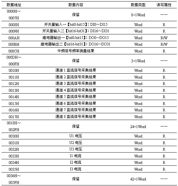  直流信號采集結(jié)果(數(shù)據(jù)地址0010H~0017H)。該寄存器數(shù)據(jù)位十六位有符號整型,待測信號的電流值分辨率為0.01mA,即如讀出值為3E8H(十進制1000),則實際電流值為10.00mA。數(shù)值為負時,表示實際信號接線與產(chǎn)品表示相反。