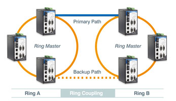 對于部分系統(tǒng)來說,將現(xiàn)有設(shè)備連接起來形成一個(gè)大冗余環(huán)是比較困難的,因?yàn)樵O(shè)備的分布比較分散。NPort®S8455IMM-SC支持Ring Coupling,可以讓分布在不同地點(diǎn)的設(shè)備形成若干個(gè)小冗余環(huán),并且這些小冗余環(huán)之間可以通過網(wǎng)絡(luò)相互連接。