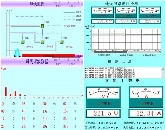 主要檢測(cè)數(shù)據(jù)對(duì)象有母線電流、電壓、功率、電能、母線諧波數(shù)據(jù),各個(gè)支路電壓、電流、功率、電能,及各個(gè)支路的分合狀態(tài)。顯示以數(shù)字顯示、折線圖、柱狀圖為主,見圖3。