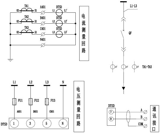 該儀表主要監(jiān)測(cè)電流大于63A的回路。儀表不需要工作電源,功耗≤2W;電壓信號(hào)輸入,220V/380V 50Hz;電流信號(hào)輸入,一次電流不大于63A可直接輸入,63A以上二次輸入0~5A。主要功能有測(cè)量常規(guī)的三相交流電量,如相電壓、線電壓、電流、有功功率、無功功率、視在功率、功率因數(shù)等,其中功率與功率因數(shù)可同時(shí)檢測(cè)分相與三相總的參量;電能有四象限電能,包括吸收有功電能,釋放有功電能,感性無功電能,容性無功電能;該儀表可用于1個(gè)三相回路中也可用于3個(gè)獨(dú)立的單相回路。