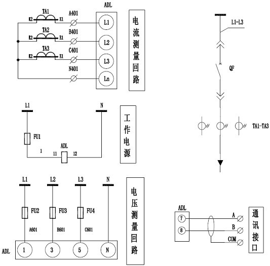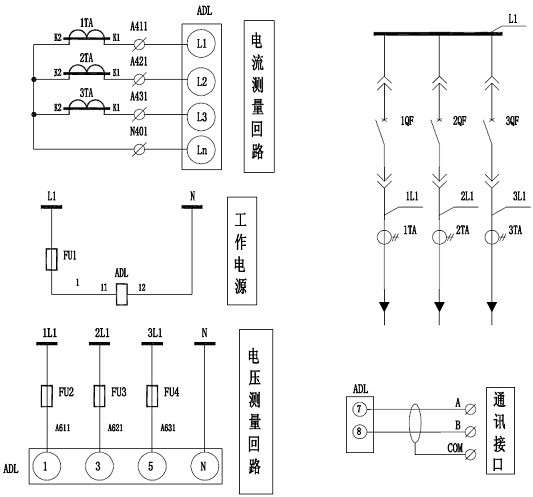 用于三相回路的二次原理見圖7,ADL-300E支持0.05A電流信號(hào)接入,電流互感器二次側(cè)不允許接地。